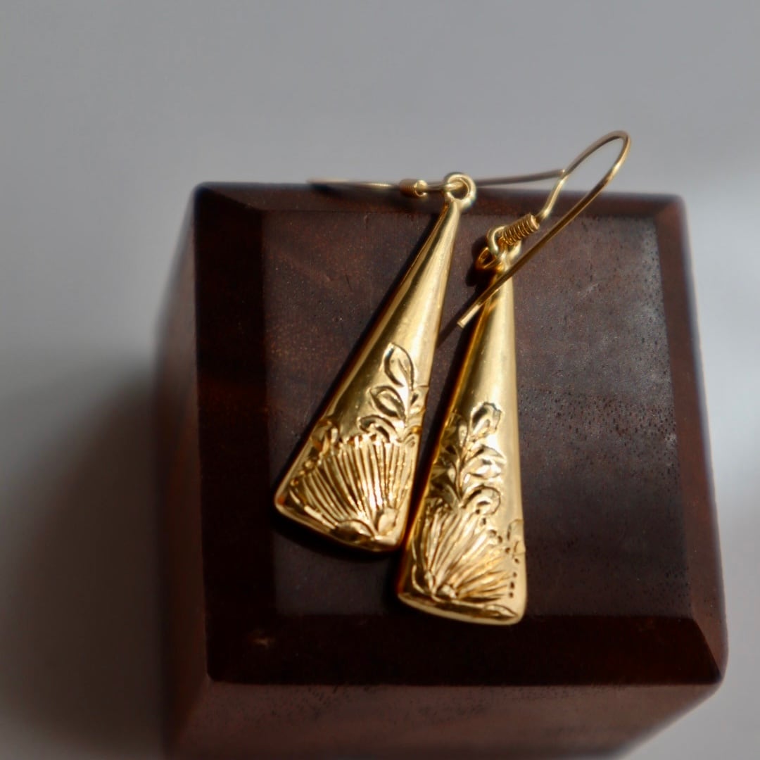 大きくお花を彫り入れた、三角形のフックピアスです。