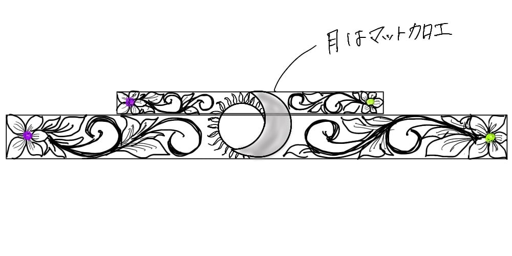 デザイン:太陽・月・トロピカルフラワー(アメシスト・ペリドット)・スクロール