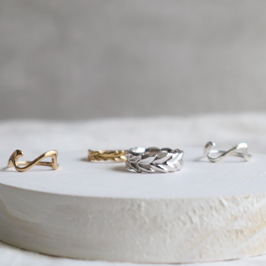 ウェーブの山は二つあるので、どこを中央に持ってくるのかで印象が変わる楽しいリング。