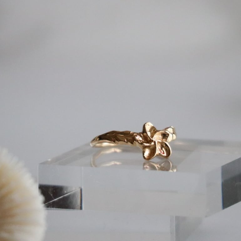プルメリアモチーフが目を引く、女性らしいV字のデザインリングです。
